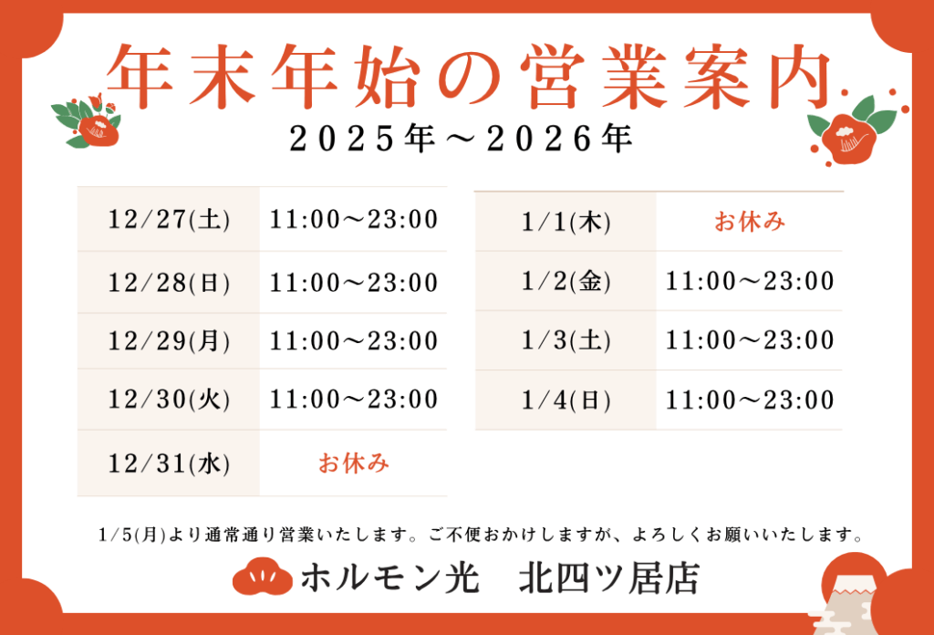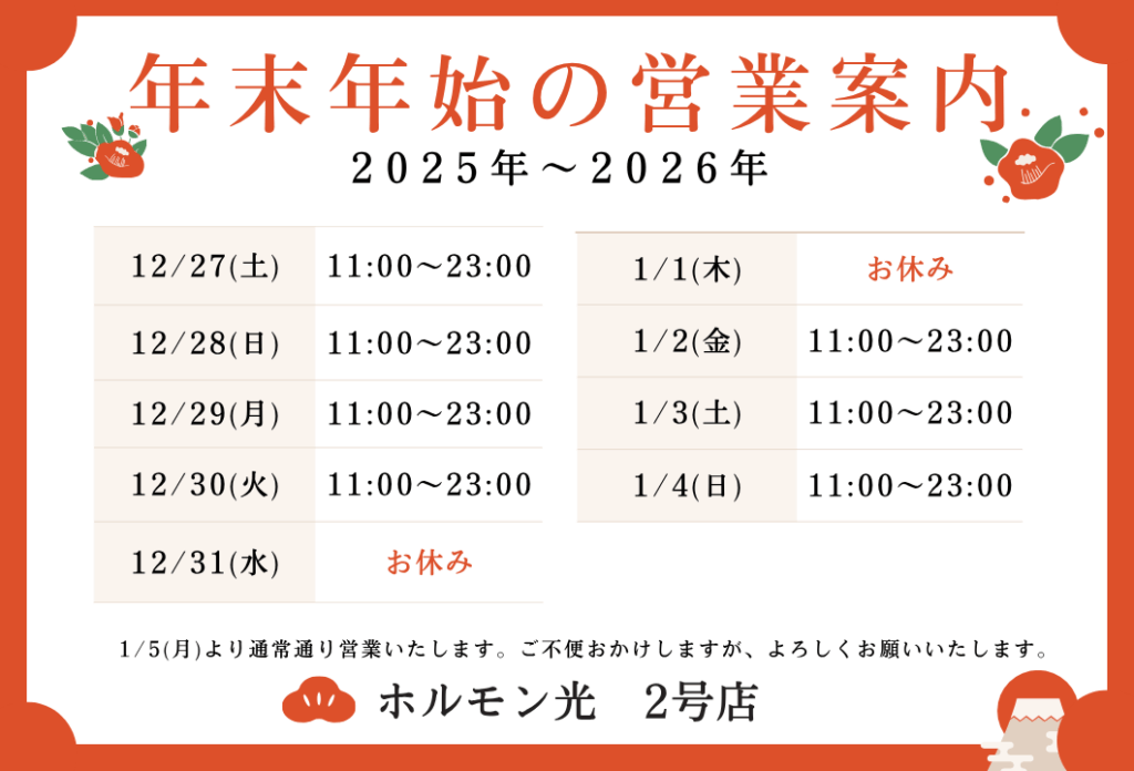2025-2026年末年始営業時間は下記の通りとさせていただきます。