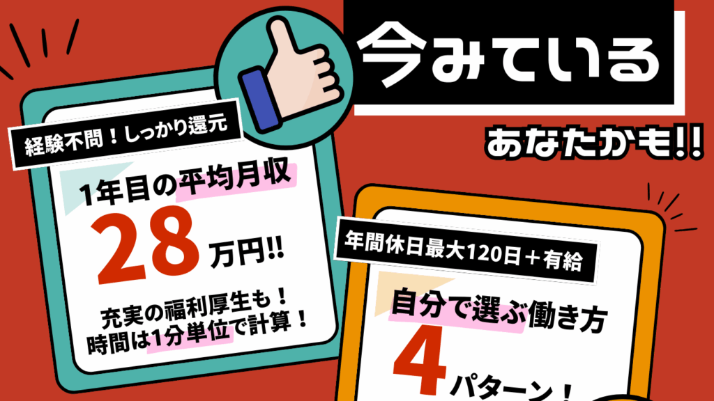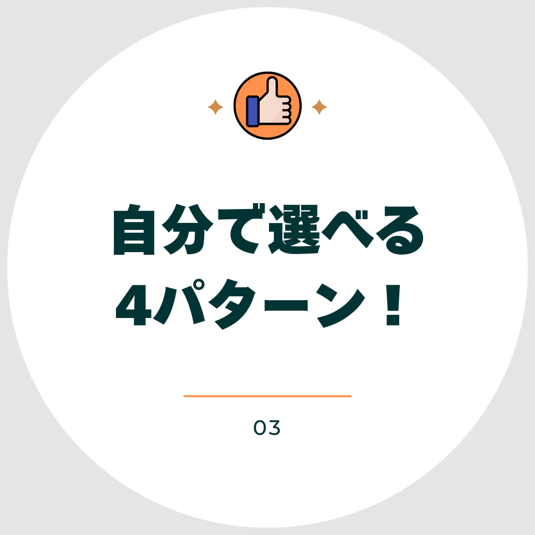 変形労働時間制!休日休暇が①月8回、②月9回、③月10回、④月10回(時短勤務)の4パターンから選べます!ライフスタイルにより途中変更OK。