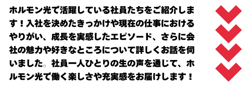 「ホルモン光では月1回の面談があり、キャリアアップのチャンスが常に用意されています。そのため、社員一人ひとりがやる気に満ち溢れている職場だと思います。」