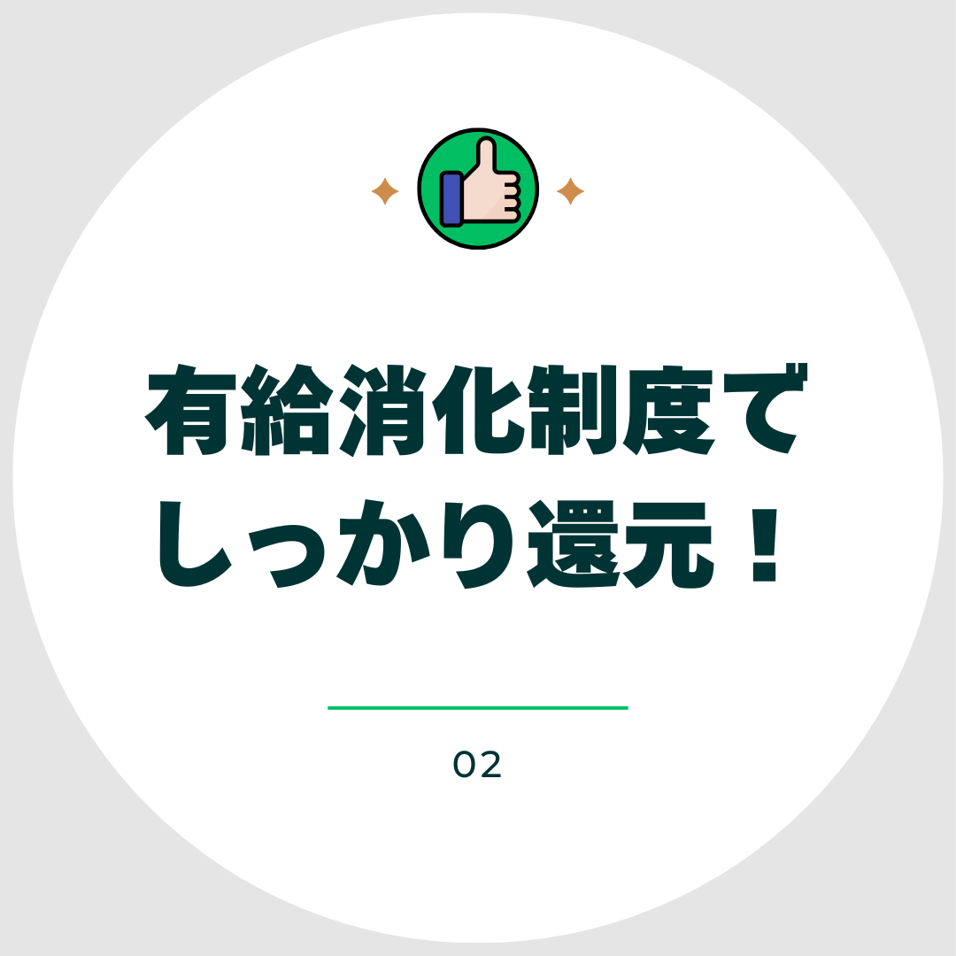 使い切れない有給は、お金で還元できます!社員の声から生まれた制度です。有給休暇としての消化も、もちろんOK!自分でどちらか好きな方を選択できます。